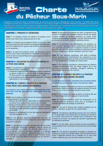 Engagées conjointement dans la représentation de la pêche sous-marine au Grenelle de l’environnement, la FCSMP, association ngagées conjointement dans la représentation de la pêche sous-marine au Grenelle de l’environnement, la FCSMP, association d’usagers œuvrant pour la défense et la promotion d’une pratique durable et la FFESSM, fédération délégataire poursuivant les ’usagers œuvrant pour la défense et la promotion d’une pratique durable et la FFESSM, fédération délégataire poursuivant les mêmes buts au travers de ses formations et stages fédéraux, s’associent dans la promotion de la charte du pêcheur sous-marin êmes buts au travers de ses formations et stages fédéraux, s’associent dans la promotion de la charte du pêcheur sous-marin responsable et encouragent l’ensemble des pêcheurs sous-marins à la respecter.
